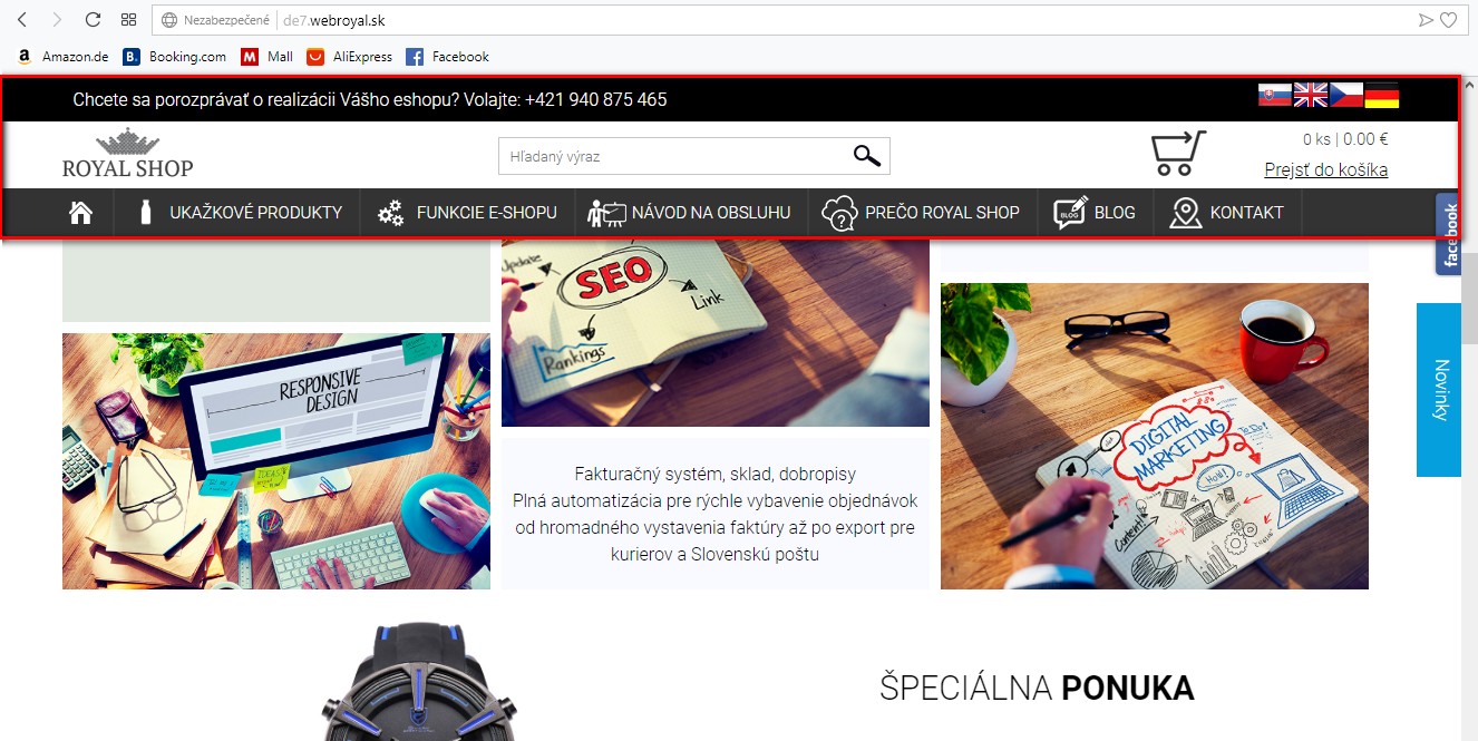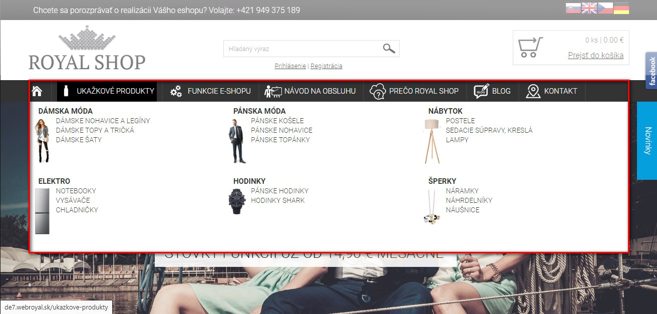 Máte možnosť zapnúť fixovanie hlavičky webu. Táto sa pri pohybe smerom dole zmenší a ostane v hornej časti okna prehliadača. Umožňuje to rýchly prístup napr. ku košíku, vyhľadávaniu či článkom.