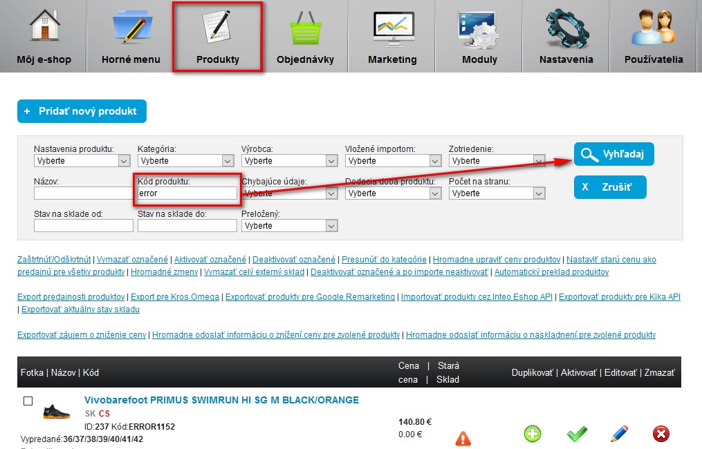 Kliknite na veľkú ikonu produkty, čím sa Vám zobrazí zoznam produktov. Použite vyhľadávanie na kód produktu do ktorého zadáte: error a kliknete na vyhľadať, čím získate produkty s kódom error: