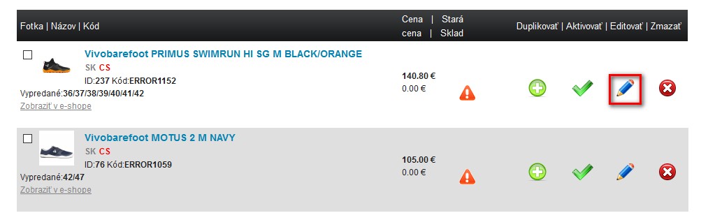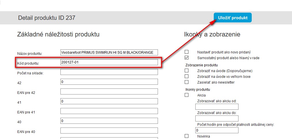 Následne editujte produkt, produkt podľa názvu vyhľadajte vo vašom MK softe a zapíšte namiesto kódu produktu "error", kód zadaný v MKsofte a kliknite na uložiť.