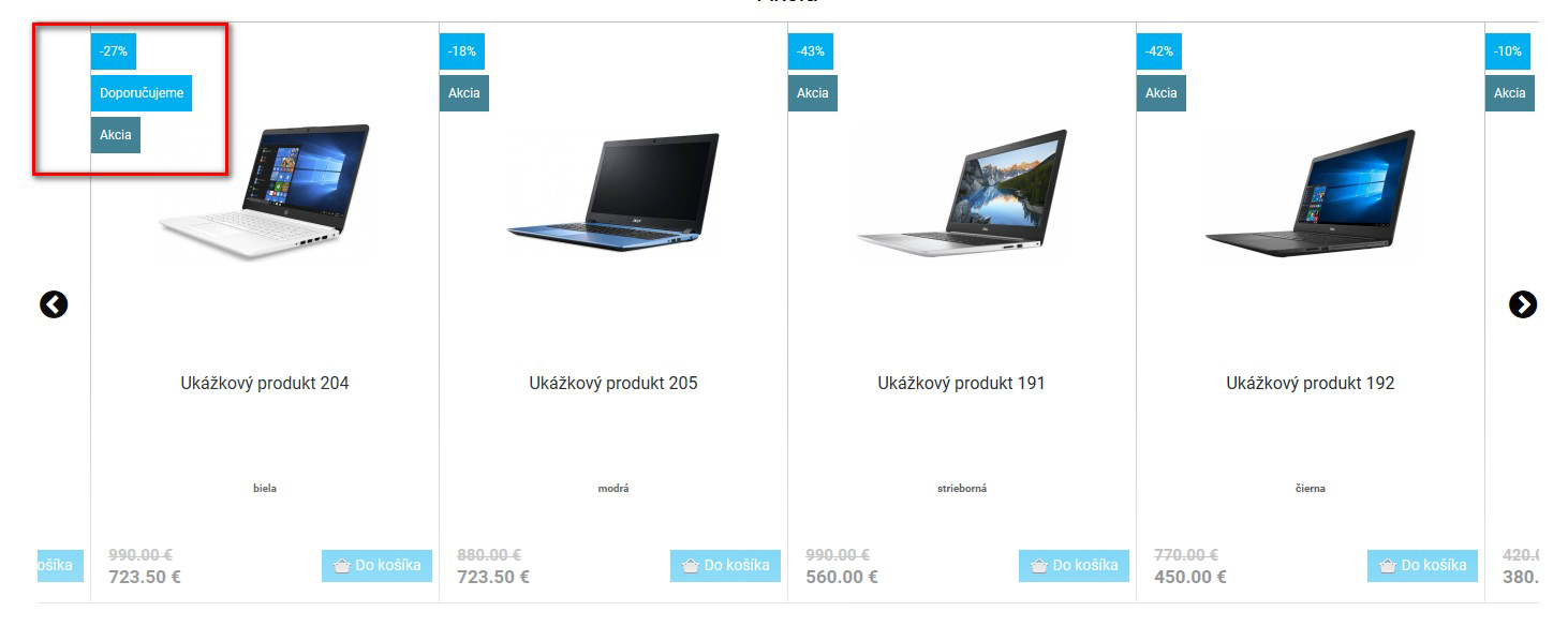 Slovenský zákazník veľmi rád nakupuje akciový tovar alebo využíva výpredaje na získanie lepšej ceny. Je tu aj skupina, ktorá si potrpí na novinkách. Každému produktu viete nastaviť „visačku“, kde pri prechádzaní katalógu každý jasne vidí, že sa jedná o zaujímavý tovar. Pre zvýšenie pohodlia si môžete nastaviť aj dátum, kedy sa toto označenie vypne.