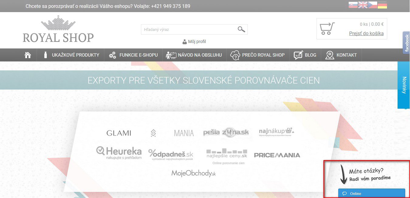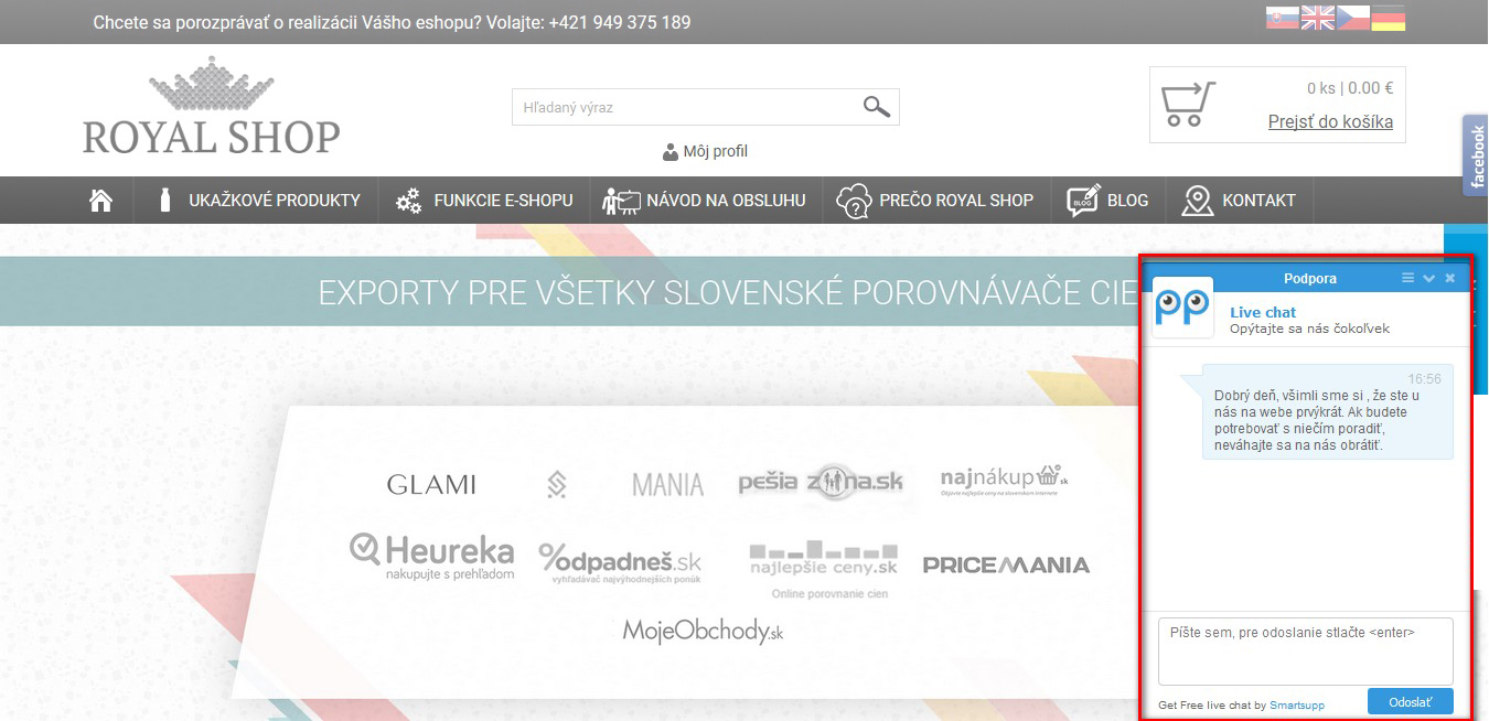 Marketingový nástroj, v ktorom dokážete sledovať pohyb zákazníka po stránke. Keď sa ho rozhodnete osloviť, objaví sa mu okno, kde mu môžete poradiť a motivovať ho k objednávke. Systém podporuje tri platformy online chatov, a to Zopim Live Chat, LiveChatoo a SmartSupp. Všetky sú pre jedného chatujúceho obchodníka bezplatné a ponúkajú podobnú funkcionalitu.
