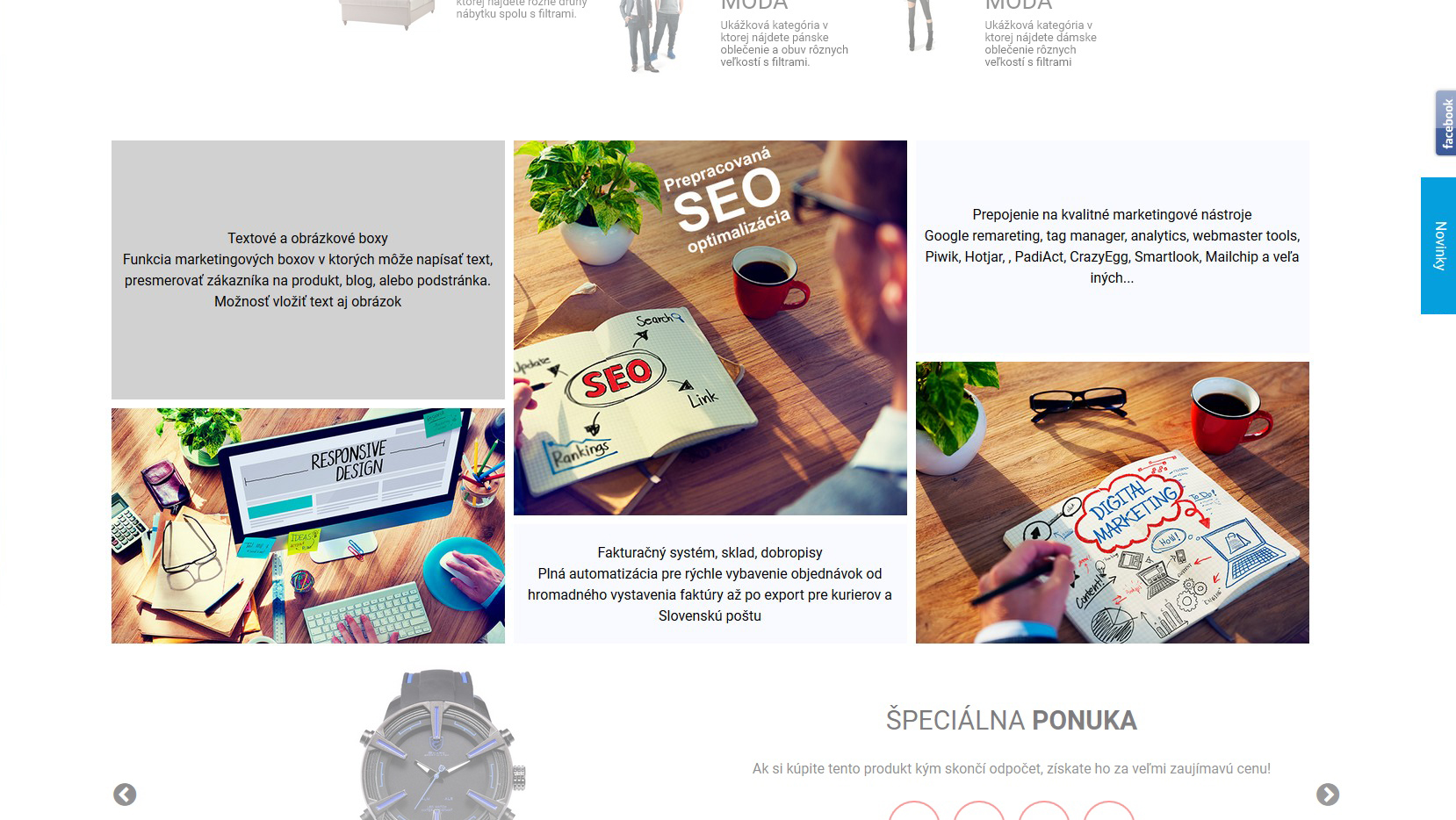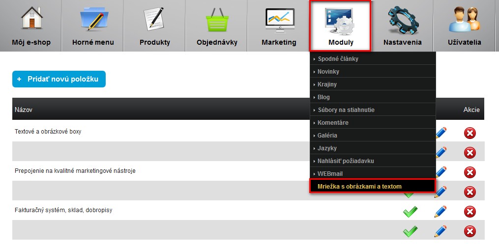 Zobrazujú sa na úvodnej stránke a môžu byť poskladané z textov a obrázkov.