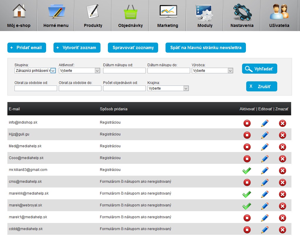 Veľmi dôležitá časť marketingu je newsletter. Môžete pomocou neho informovať zákazníkov o novinkách či zľavách vo Vašom e-shope, čo môže viesť k objednávkam. Odosielanie newslettera máte do 5 000 adries mesačne bezplatne.