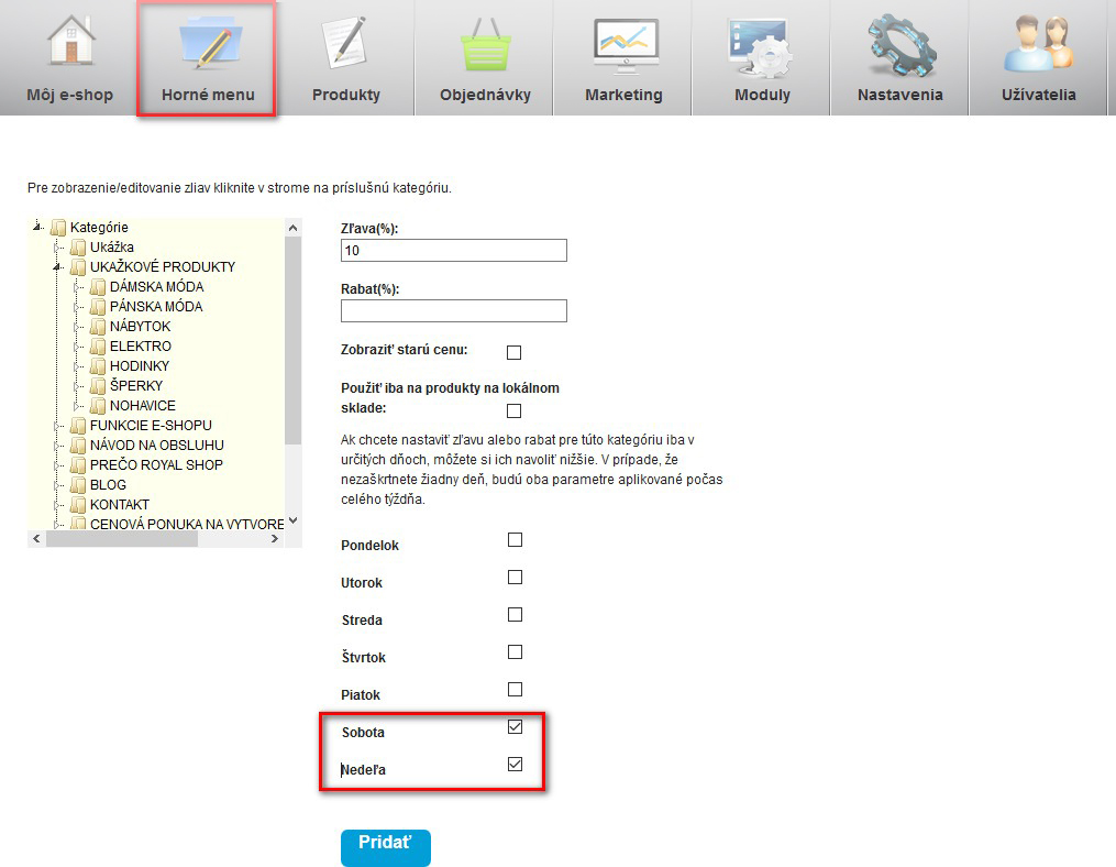 Možnosť nastavenia dní, kedy systém automaticky nastaví zľavu (akcie typu: celý víkend zľava 10%)
