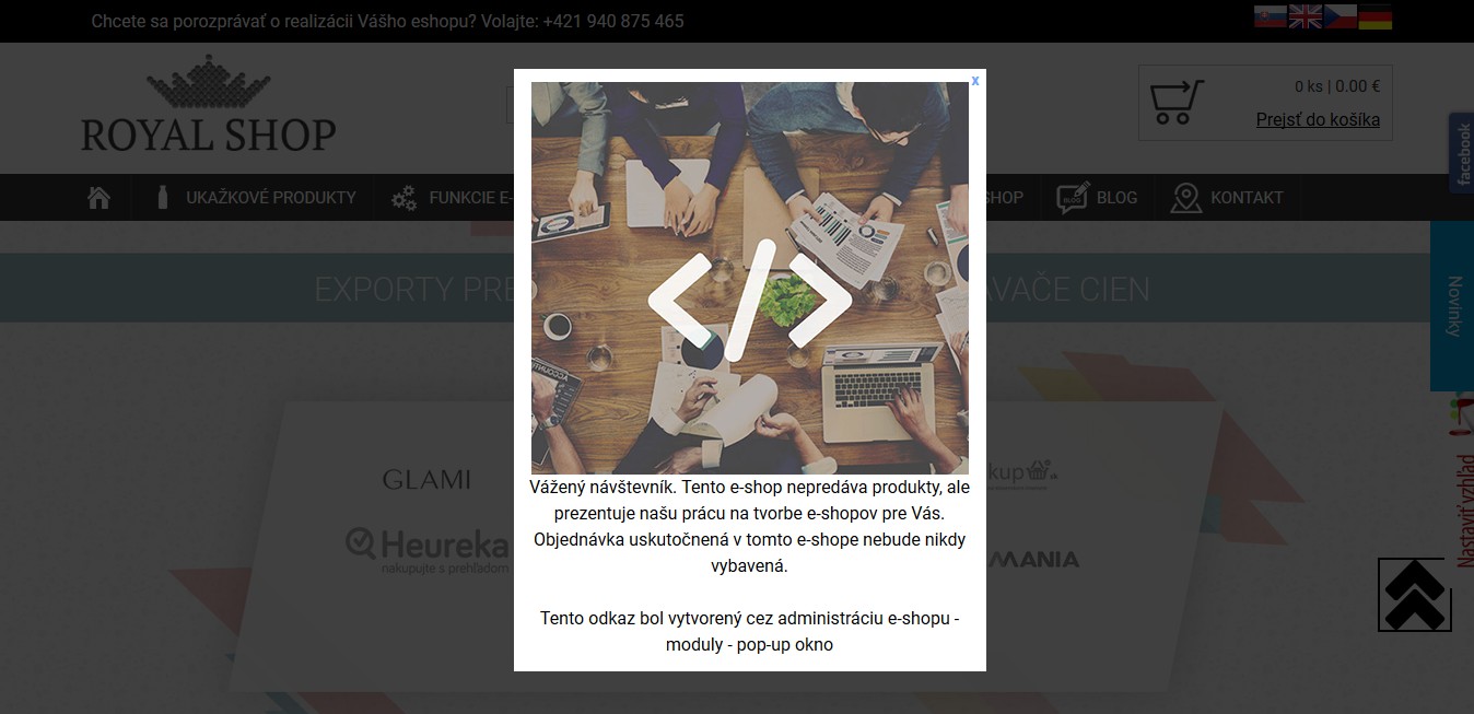 Túto funkciu využijete, ak idete na dovolenku alebo potrebujete upozorniť na dôležitý oznam, napr. o 5% zľave za registráciu. Nakoľko je do vyskakovacieho okna možné vložiť aj obrázok, využitie tejto funkcie je veľmi variabilné. Dá sa využiť aj ako potvrdzovací dialóg, ktorý sa bude zákazníkovi zobrazovať, až kým ho nepotvrdí.