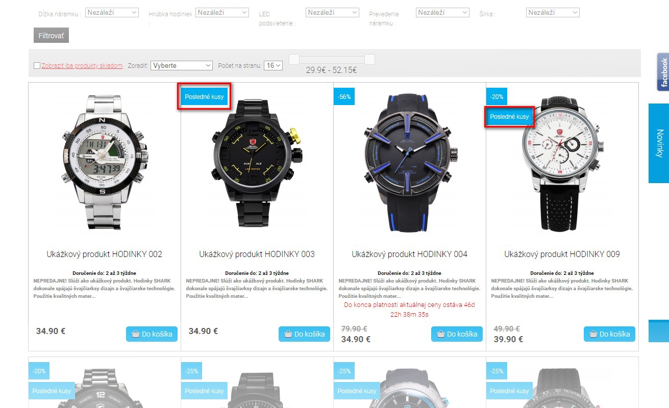 Keď budete využívať sklad e-shopu, jednou z automatických funkcií je aj definovanie hranice počtu kusov, po ktorej prekročení sa pri produkte bude v katalógu zobrazovať ikona Posledné kusy. Táto vie v zákazníkovi prebudiť záujem o objednávku (neváhať s kúpou). Dá sa aktivovať aj ručne (ak napr. nepoužívate sklad).