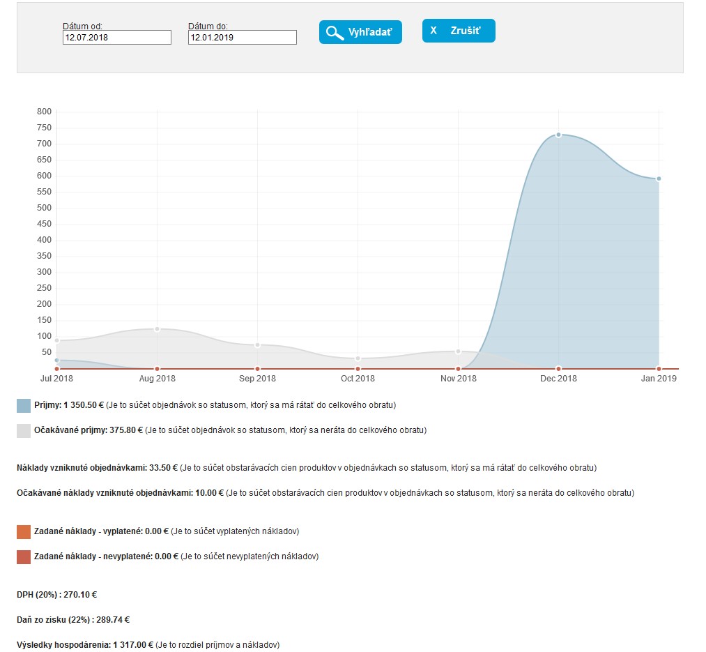 Vďaka tomu, že v e-shope môžete evidovať všetky Vaše náklady, nákupné ceny a predaje, dostanete presný výsledok o hospodárení zobrazený v grafe.