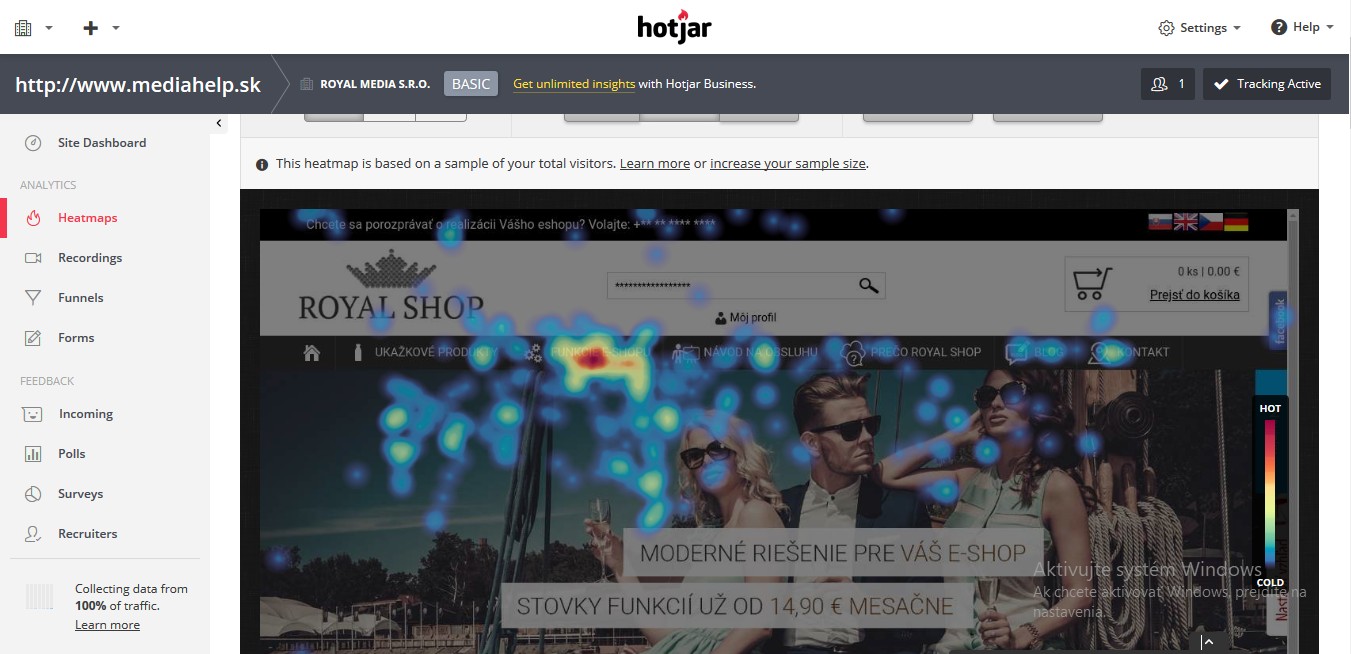Ak by ste chceli využívať teplotnú mapu, systém obsahuje aj prepojenie na službu Hotjar, kde sa stačí zaregistrovať. Získate tak prehľad o tom, ktoré odkazy a položky na stránke sú pre používateľov najzaujímavejšie.
