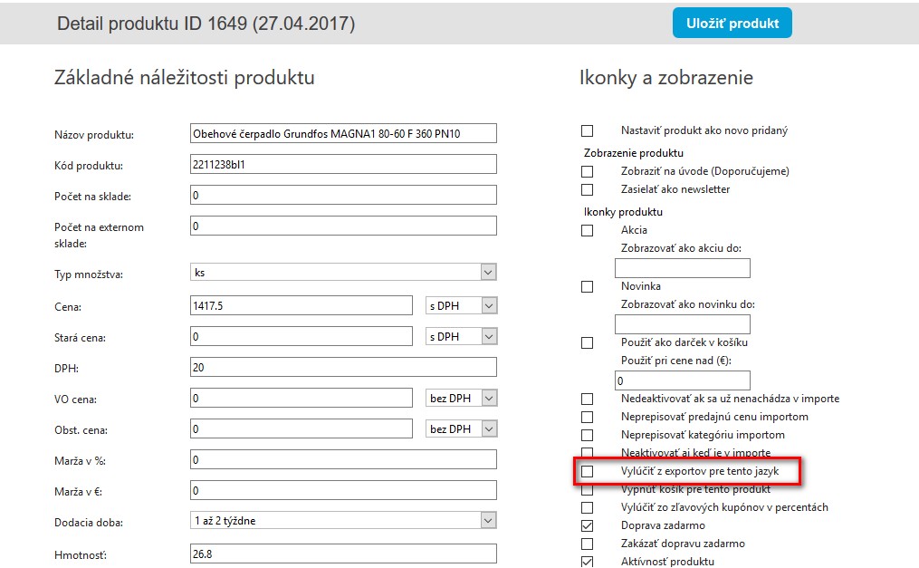 V detaily produktu sa nachádza možnosť "Vylúčiť z exportov pre tento jazyk"